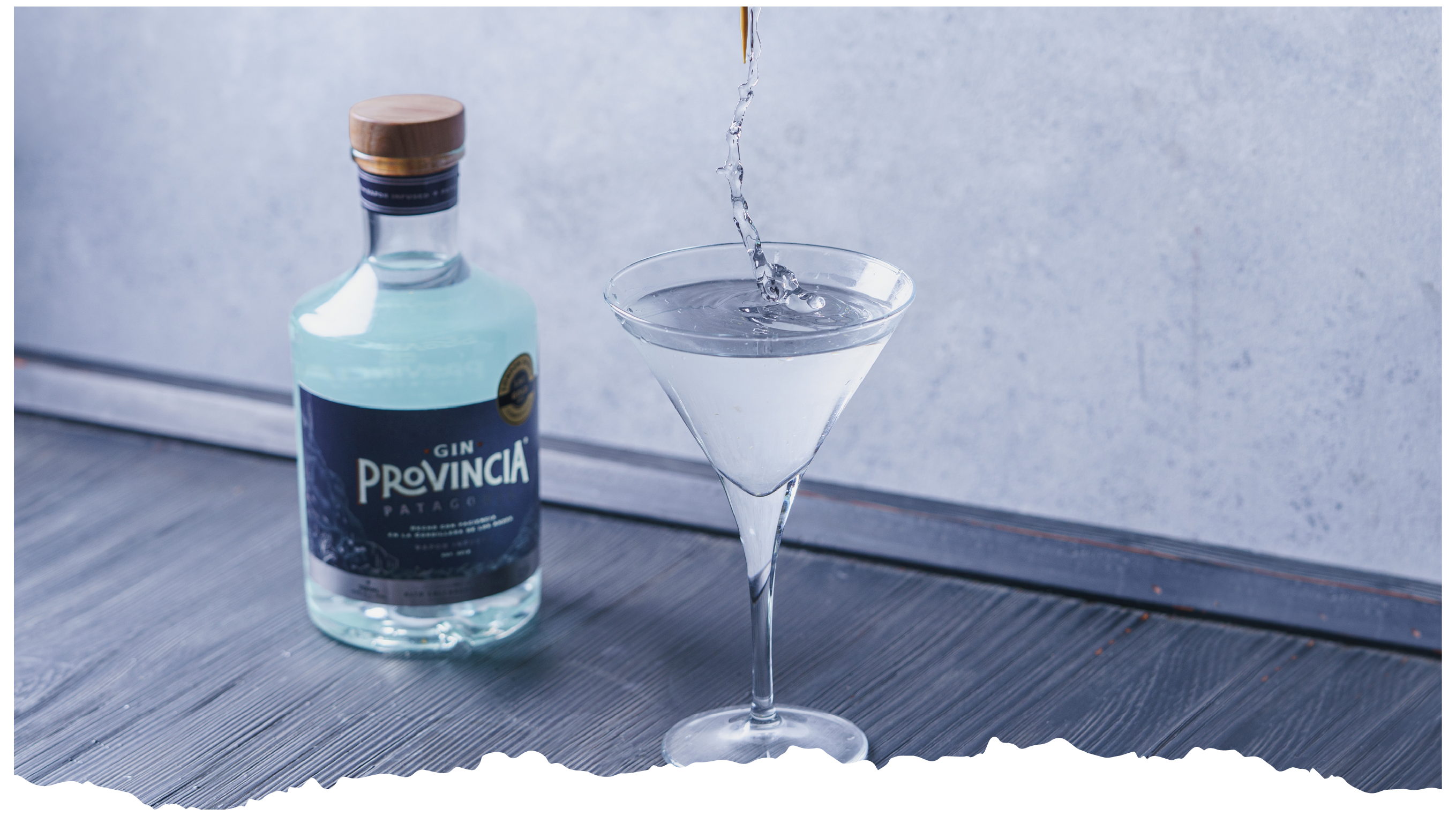 - Luego agrega el Gin Provincia Patagonia, Vermouth y hielo en un vaso mezclador y sigue revolviendo lentamente el líquido por un minuto.